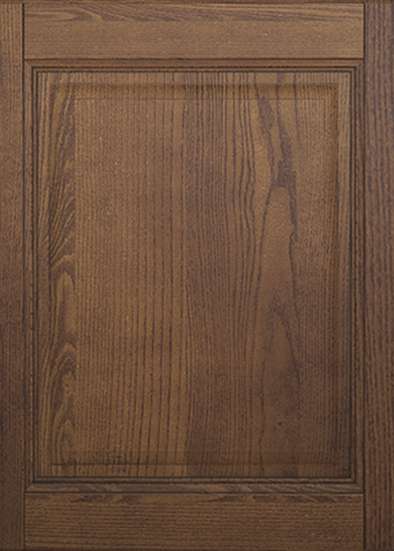 Finitura in Noce Caravaggio con doppia colonna che termina con penisola. Il contrasto cromatico con il top bianco illumina la zona operativa caratterizzata dalla cappa decorativa e dalla mensola portaoggetti